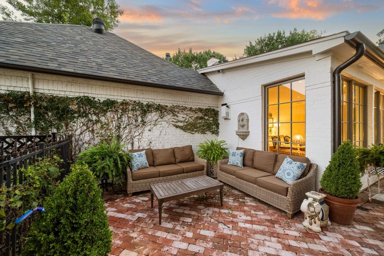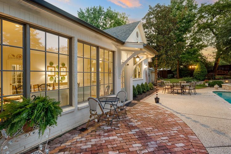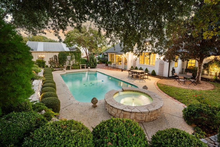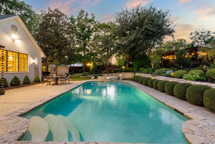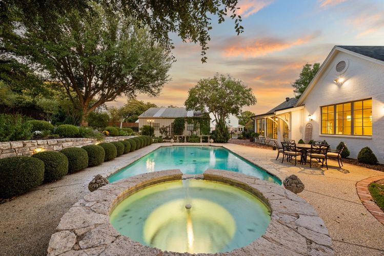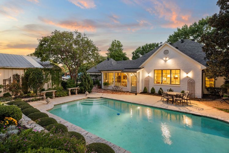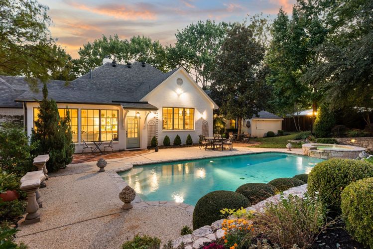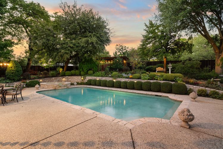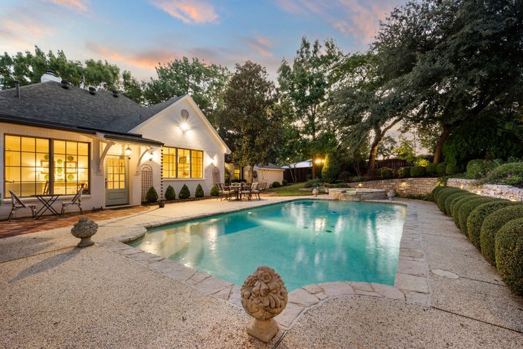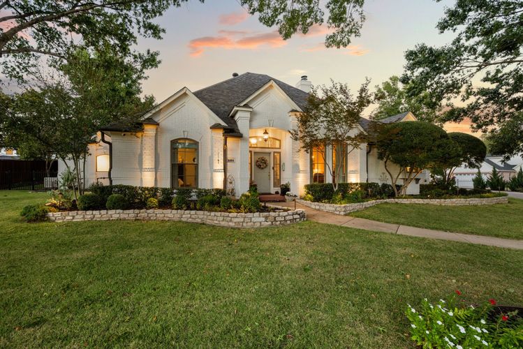 Brimming with warmth and sophistication, this beautifully appointed home in Sunrise Terrace showcases refined design choices and a thoughtful floor plan. Located in the heart of Colleyville and zoned for top-rated Grapevine-Colleyville ISD schools, the home offers convenient access to local parks, dining, and shopping in both Colleyville and nearby Southlake. From its classic architectural façade to its rich interior detailing, every space exudes character. The formal living room welcomes you with elegant millwork, high end sconces, and a gas fireplace, setting a gracious tone for entertaining. A double-sided fireplace connects the space to the inviting family room, painted in deep moody tones with built-in bookcases, designer lighting, and layers of texture. Just beyond, the study offers built-in cabinetry and a desk area. The kitchen blends timeless craftsmanship with chef-grade functionality featuring an Ilve range, cabinet-front Sub-Zero refrigerator, large Perla Venata Quartzite island, and walk-in pantry with double ovens. A wall of windows overlooks the backyard and bathes the space in soft natural light, while the adjoining sunroom—with brick floors, fireplace, and custom millwork—creates the perfect breakfast nook or cozy retreat. The utility room continues the home’s sophisticated palette with rich cabinetry, a sink, microwave, and dishwasher, providing a beautiful yet practical workspace that can also serve as a butler's pantry. Outdoors, a pool and spa serve as the centerpiece of the beautifully landscaped backyard, complemented by a pergola, brick patio, and meandering garden pathways.