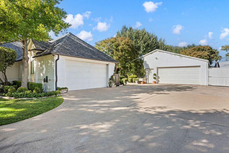 The detached 1,200-square-foot, climate-controlled workshop is a standout feature for car enthusiasts, complete with electric service, a lift, a storage loft, and a full workspace. An attached two-car garage provides additional parking. This home is a true blend of craftsmanship, comfort, and character—a rare Colleyville find. **Study could be used as a fourth bedroom.