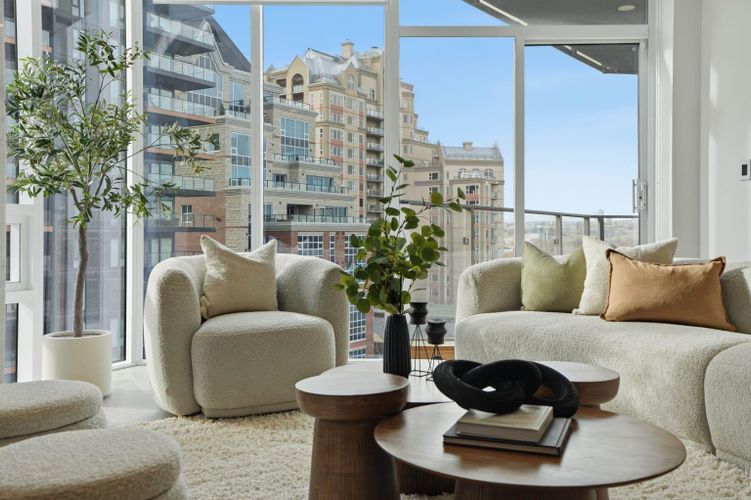 **NEW PRICE** PRESTIGIOUS | PRIVATE ELEVATOR | HIGH FLOOR | CITY SKYLINE & RIVER VIEWS | 2 BEDROOMS + DEN | TWO TITLE PARKING STALLS! WELCOME TO THE CONCORD - Calgary's most prestigious riverfront residence, an architectural icon that defines luxury living! Experience this unparalleled luxury large unit living at The Concord, where a private elevator transports you directly into your exquisite residence. This stunning home is designed with the finest finishes and features, including a German-engineered Poggenpohl kitchen, Miele appliances. The thoughtfully crafted interior boasts engineered hardwood flooring, Bianco Carrara marble accents, rich walnut detailing, a full-height Bianco Statuario marble encased fireplace, and floor-to-ceiling windows showcasing breathtaking Bow River views. Enjoy year-round comfort with heated tile flooring, a horizontal four-pipe fan coil system for heating and cooling, and a BRIGHT GLASS DOOR OPEN DEN perfect for a home office. The spacious primary suite is a private retreat with a custom walk-in closet, and a 5-piece spa-inspired ensuite, complete with dual sinks, a deep soaker air-jet tub, a separate shower and heated marble floors. A patio door leads to a private balcony, offering a serene escape with stunning city and Bow River views. The second bedroom also enjoys balcony access and its own floor-to-ceiling marble bathroom with heated floors. Additional features include an in-suite full-size washer and dryer, two titled side by side parking stalls, and a titled storage room. World-Class Building Amenities include: 24-hour Concierge & Security services | 6 high-speed Elevators | Elegant Social Lounge with a Bar, full kitchen for your private events | State-of-art Fitness Centre | Touch-less automatic car wash | Ample guest parking | Stunning outdoor water garden and pond (transforms into a winter Skating rink) | Outdoor kitchen with BBQ and 2 fire-pits, perfect for entertaining. Exciting future amenities (Phase II - L aunching in May, 2025) include: Resort-style swimming pool and a hi-tech golf simulator. With unparalleled elegance, world-class amenities, and the best value in The Concord. This offering is truly one-of-a-kind and best value in Calgary RIVER FRONT luxurious living. CALL TODAY TO SCHEDULE YOUR PRIVATE VIEWING! (id:26452)