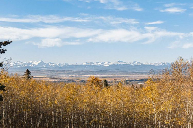 This exceptional, one-of-a-kind property offers the best of Springbank living — privacy, tranquillity, and breathtaking Rocky Mountain views. Set on a picturesque 2.17-acre lot in the heart of Pinnacle Ridge, this walkout bungalow sits high on the ridge, surrounded by beautifully landscaped grounds that provide seclusion from the street and neighbours. Tucked away from main roads, the property features its own private ravine, approximately one acre of mature trees and natural landscape, offering beauty and privacy while minimizing yard maintenance. A circular driveway flanked by mature trees sets the tone from the moment you arrive — this is truly something special. Inside, you’re greeted by stunning mountain vistas and an open layout. The beautifully renovated kitchen features a large island, granite countertops, and high-end appliances, including a Sub-Zero refrigerator, wine fridge, microwave, and 48” Wolf gas range. It opens to a bright dining space and sitting area with access to the large main deck (23' x 22'). The spacious living room, complete with a fireplace, perfectly frames the magnificent mountain backdrop. The main-floor primary suite offers a luxurious six-piece ensuite and a generous walk-in closet. The main level also includes a home office, two powder rooms, a walk-in pantry, and a mudroom that connects to an oversized four-car garage. The 54' x 26' garage (1,279 sq. ft.) is insulated, drywalled, painted, and finished with epoxy flooring, with half the space offering a 12’3” ceiling that is ideal for large trucks or lifts. The walkout lower level features a large recreation room, a wet bar that seats up to ten, a dedicated theatre room, three additional bedrooms, and two full baths. Cherry hardwood and tile flooring flow throughout the home, with wool carpet in the lower-level bedrooms for added comfort. The exterior showcases stucco and stone, complemented by a newer asphalt shingle roof (2020, 50-year warranty). An enclosed under-deck storage roo m is ideal for garden tools or a ride-on mower. This immaculate property has been meticulously maintained by its current owners, with recent mechanical upgrades including two new furnaces with humidifiers (2019) and two new air-conditioning units (2024). A truly remarkable estate combining privacy, panoramic views, and refined living in one of Springbank’s most sought-after locations. (id:26452)