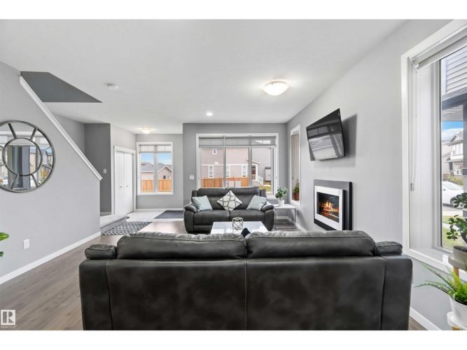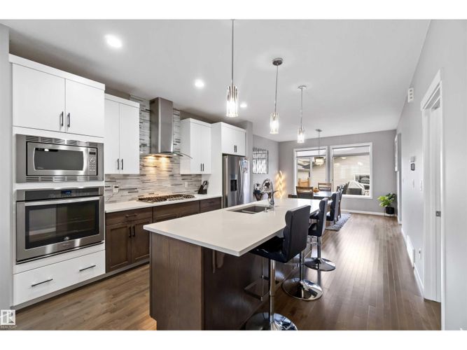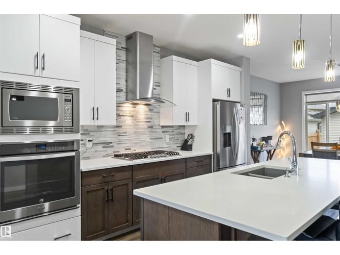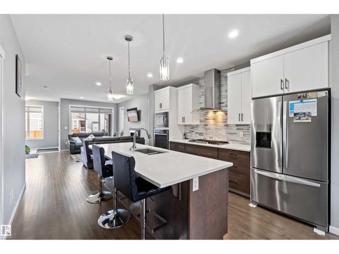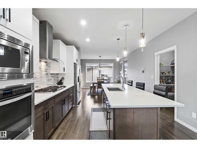 Welcome to this custom-built Morrison home offering over 1,800 sq. ft. of beautifully designed space in the heart of McConachie, one of northeast Edmonton’s most family-focused communities. The open main level features 9-ft ceilings, rich hardwood floors, and sun-filled living spaces that feel both elegant and inviting. The chef-inspired kitchen is the heart of the home, complete with quartz countertops, an oversized island, gas cooktop, built-in oven, and a generous walk-in pantry — perfect for family gatherings and effortless entertaining. Cozy evenings await by the fireplace, while upstairs the primary suite offers a serene retreat with a 4-pc ensuite and walk-in closet. Two additional bedrooms and a versatile bonus room provide space to grow, work, and play. Thoughtful upgrades include central A/C and a soundproofed laundry room. Steps from parks, trails, and excellent schools, this home blends luxury, comfort, and family living seamlessly. (id:26452)