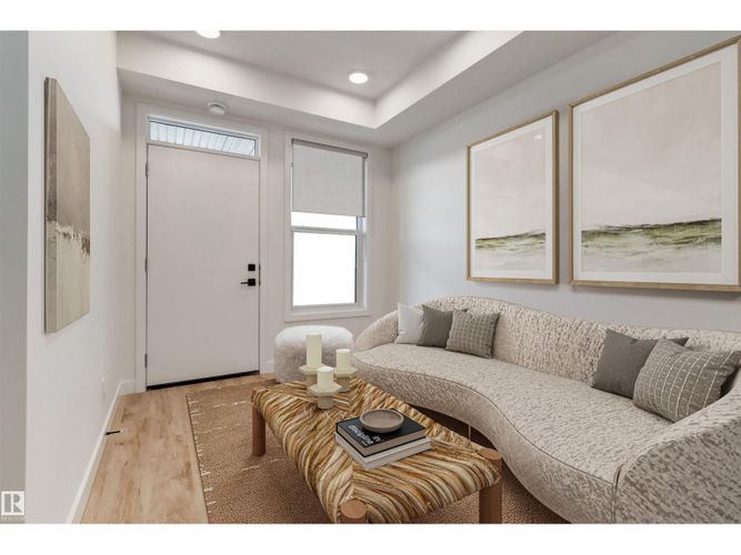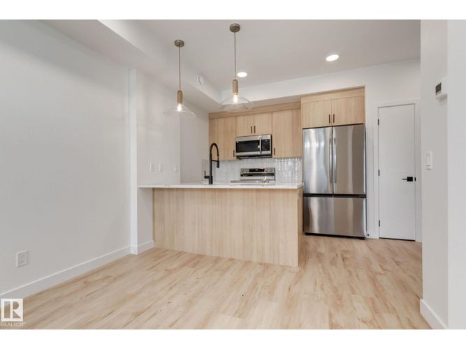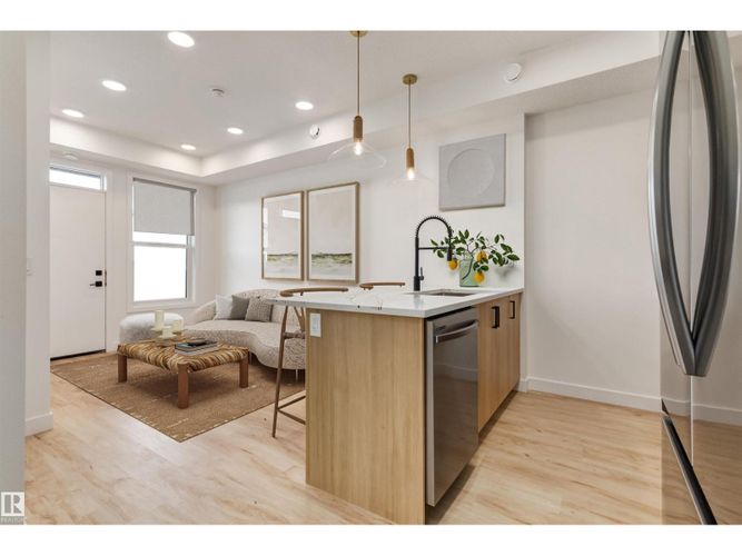 Experience effortless modern living in this Glenridding Essential condo featuring the thoughtfully designed Cedar model by award-winning Rohit Homes. This single level has the Rohit’s serene Ethereal Zen interior palette, the space blends soft tones, natural textures, and calming design elements to create a warm, modern ambiance. This thoughtfully designed floor plan offers a functional main-floor layout, featuring a contemporary kitchen with a central island that flows into a bright living area with direct access to a private patio—perfect for relaxing or entertaining. The home includes a comfortable bedroom, a 4-piece bathroom, in-suite laundry for everyday convenience, and an assigned parking stall. Ideally located close to schools, parks, interconnected walking trails, Whitemud Creek Ravine, Jagare Ridge Golf Course, and the Currents of Windermere shopping and dining district. Property under construction, photos of a different unit with the same layout and finishes, virtually staged for illustration. (id:26452)
