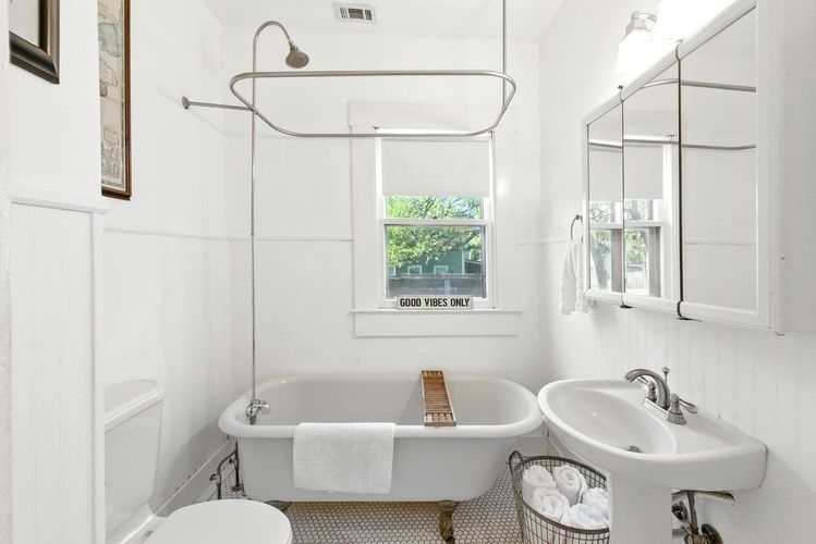 Vintage charm abounds, from the original wood plank flooring to the inviting large front porch with dual entry doors and a view of downtown. Thoughtful updates bring modern livability, including a refreshed kitchen with honed countertops, stainless steel appliances, and timeless finishes. Windows throughout frame leafy views, while outdoor decking wraps the home, creating a peaceful, low-maintenance setting for entertaining or future expansion.