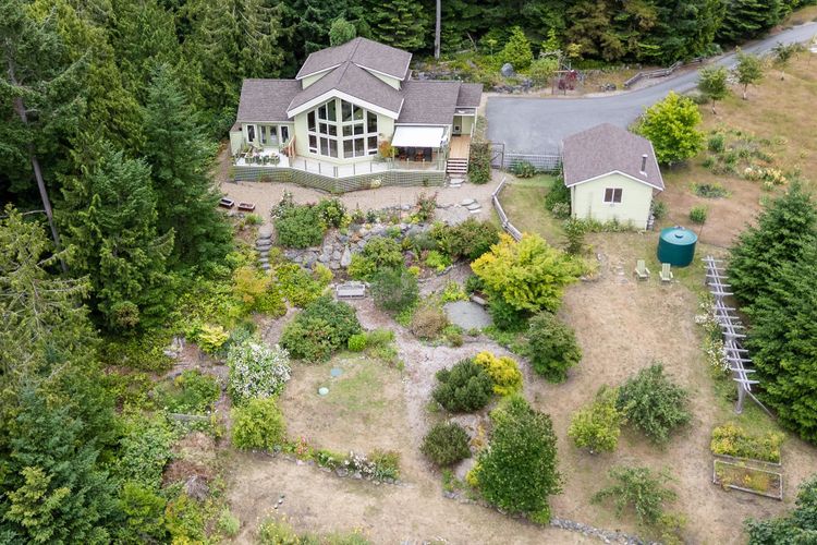 This stately property is a welcoming sight to the island. Sitting proud on 4.27 acres with ocean views over Active Pass. Meticulous home and gardens that have been well loved with systems in place for comfortable living. Primary bedroom has full ensuite with heated floors and French door exiting to a private deck. 2nd bedroom and guest bathroom on the main. Open loft with hobby room or 3rd bedroom. Expansive vaulted ceiling over the living area with wall to wall windows to take in those views. Kitchen with stone counters, dining that opens to a covered deck. Step outside to enjoy the peaceful sanctuary that has been created, take in views from one of the many outlooks. Follow the woodland trail to the fairy cabin and into the heart of Miners Bay where you'll find all your amenities.