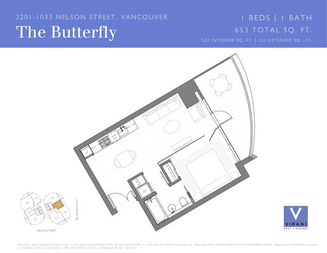The Butterfly by Westbank, a striking new addition to downtown Vancouver’s skyline. This world-class building features 331 one-of-a-kind homes. This BRAND NEW Semi-Furnished 1-bedroom, 1-bathroom unit on 22nd floor spans 653 total Sq. Ft., with 532 Sq. Ft. of interior living and 121 sq. ft. of exterior space. The custom interior includes a eucalyptus veneered front door, large white porcelain flooring, Italian-crafted kitchen with Miele appliances. Floor-to-ceiling sheer drapery and curved glass walls enhance the light-filled space. LEED Gold certified, the building excels in energy efficiency and water conservation. Amenities include a 24-hour concierge, sky spa pool, & gym. 1 Parking Stall, 1 Storage, 1 Bicycle Storage, 1 Bike Loop