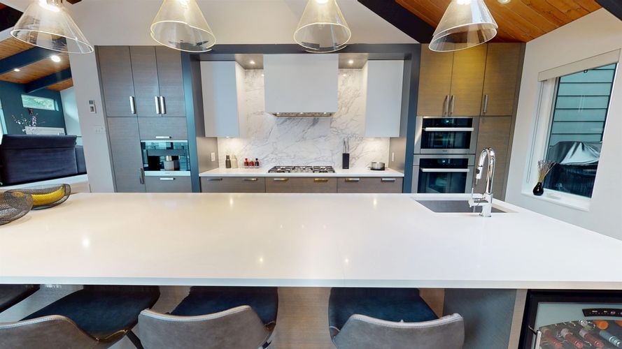 A beautifully renovated five-bedroom home bathed in natural light, with 17’ vaulted ceilings, oversized windows, & skylights enhancing its airy atmosphere. At its heart, a designer kitchen boasts a full Miele appliance suite—5-burner cooktop, convection & combi-steam ovens, warming drawer, espresso machine, and a 54" integrated fridge/freezer. Sleek Silestone counters, dual sinks, and a Statuario porcelain backsplash add sophistication. A floating glass staircase leads to a spacious living area with wide-plank European Oak flrs. Upgrades include a H/E heat pump/aircon & 200A electrical panel. Outside, a private backyard retreat offers a large patio, hot tub, & pergola-covered lounge, while a sunny rooftop deck showcases southwest ocean & city views! NEW PRICE! Showings by Appointment!
