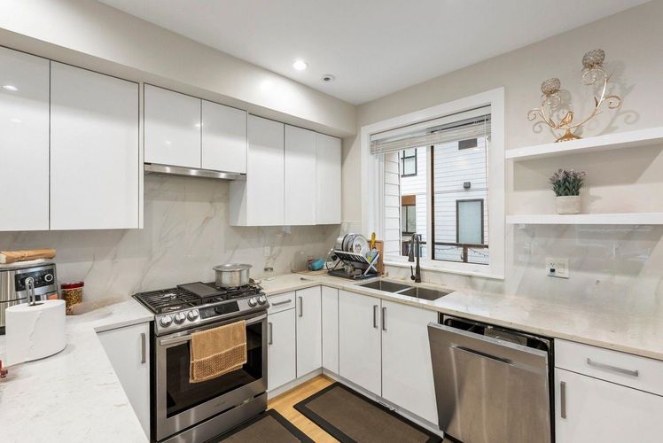 Set in the heart of Fleetwood, this 3-bedroom + den townhouse delivers modern living with thoughtful design and incredible outdoor space. The open layout blends a bright living area, electric fireplace, and large windows with a contemporary kitchen featuring quartz counters, gas stove, stainless appliances, soft-close cabinetry, built-in microwave, and a walk-in pantry. Upstairs, all three bedrooms sit together, including a spacious primary suite with a spa-inspired ensuite. The showstopper is the 650+ sq.ft. private rooftop deck—perfect for sunsets, gatherings, and effortless entertaining. With laminate flooring throughout and a double side-by-side garage, this home brings comfort and convenience steps to shopping, parks, transit, and the future SkyTrain.