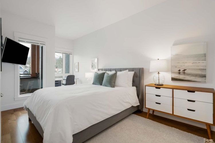 Fully renovated 1-bedroom penthouse at The Vue, quietly situated on the north-facing side with serene mountain views. This top-floor home offers 9’ ceilings, an open layout, and an unusually large 734 sqft. The spacious bedroom features a custom walk-in closet and office nook. Quality updates include premium engineered hardwood floors, quartz counters, custom wood veneer cabinetry, full-size stainless steel appliances, and a gas cooktop. Built with acoustical wall construction for enhanced soundproofing. Steps to Capilano Mall, transit, shops, dining, and trails. Heat and hot water included in strata fees. 1 parking, 1 storage locker, and shared bike storage. 2 pets allowed, rentals min. 30 days.