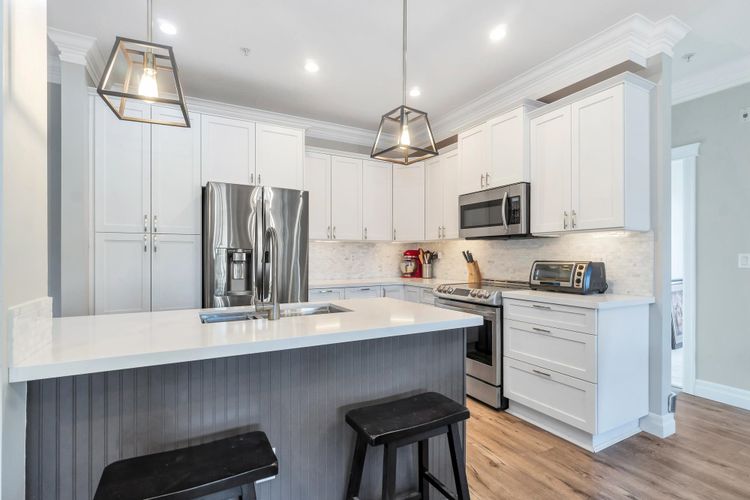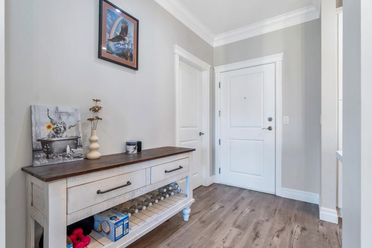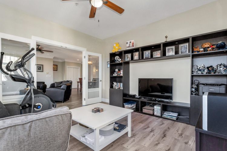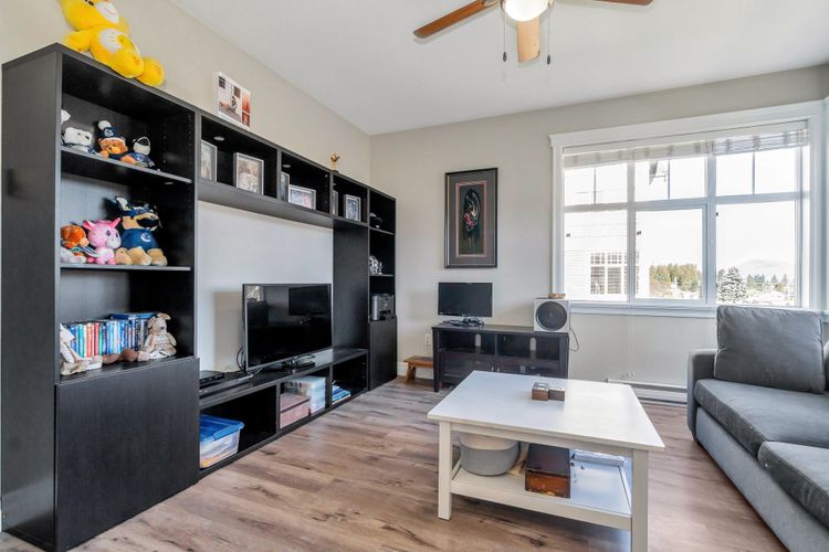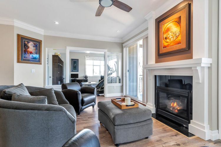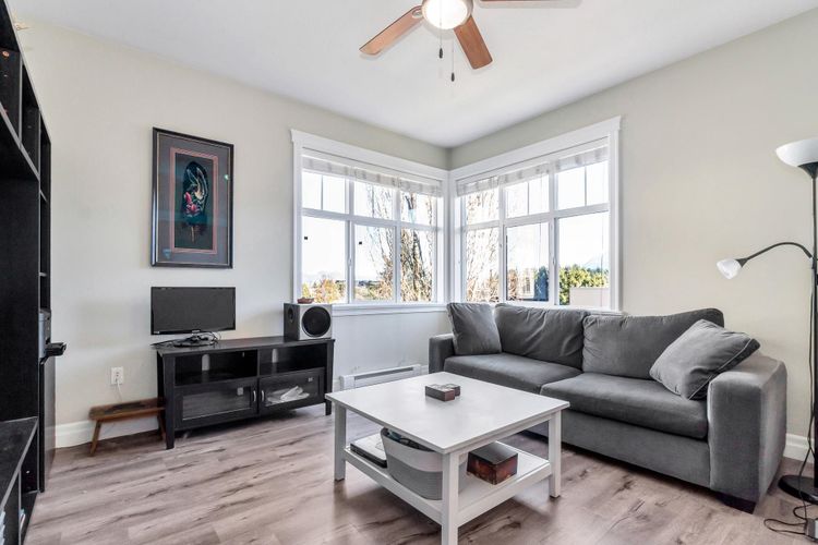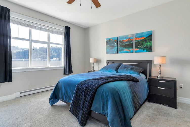 GARRISON CROSSING! MOUNTAIN VIEWS! This quiet and bright, "Rancher In The Sky" features 1,450 sqft, 2 beds, large den +2 baths. It's soaked in natural light with 9-foot ceilings and oversized wrap-around windows! Open-concept kitchen enjoys white shaker style cabinetry, large island w undermount sink, SS appliances, tile backsplash & quartz countertops! Dual sliding glass doors on each side of the gas fireplace in the living room, step out to the sprawling, fully covered balcony with MOUNTAIN VIEWS! Bedrooms are ideally positioned on opposite sides, each with walk-in closets. Luxurious 5-piece ensuite boasts large soaker tub, shower and double vanity! Side by side washer/dryer, built-ins & extra storage. 2 secure parking stalls & locker. Steps to shopping, rec centre, trails and UFV!