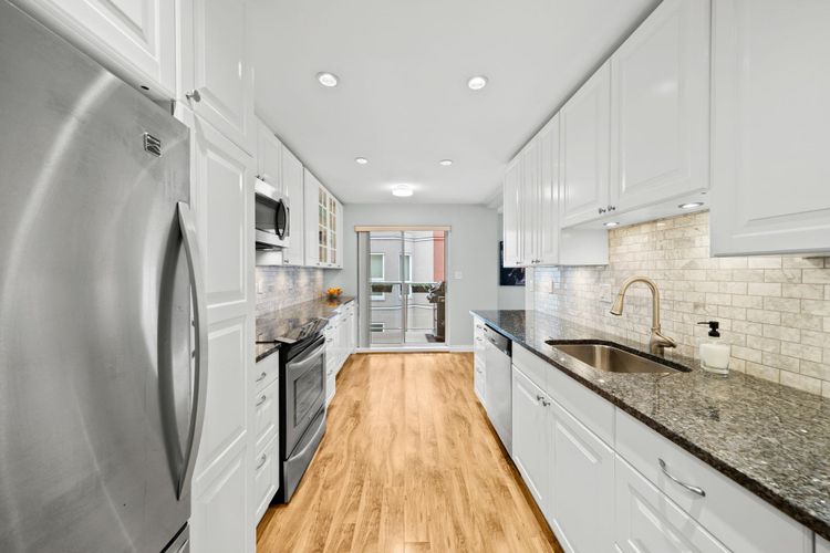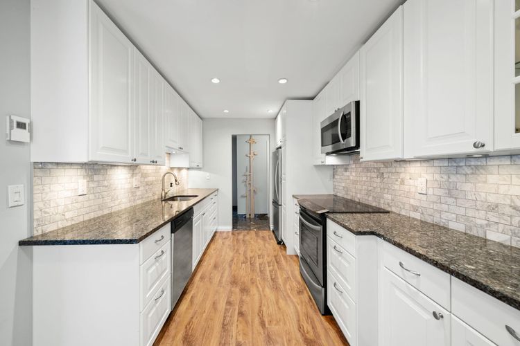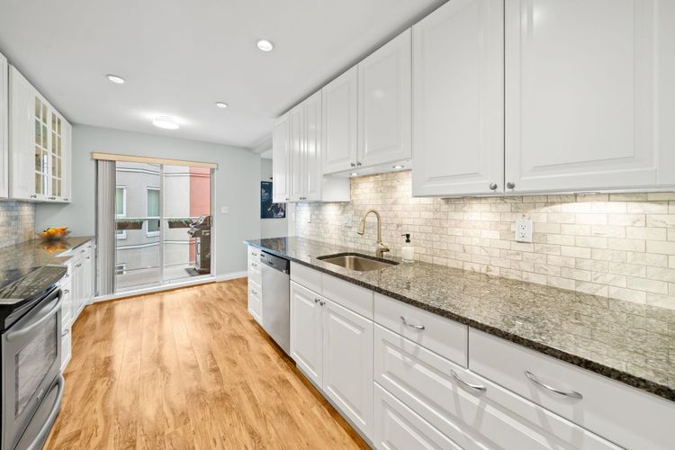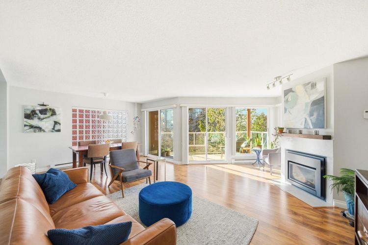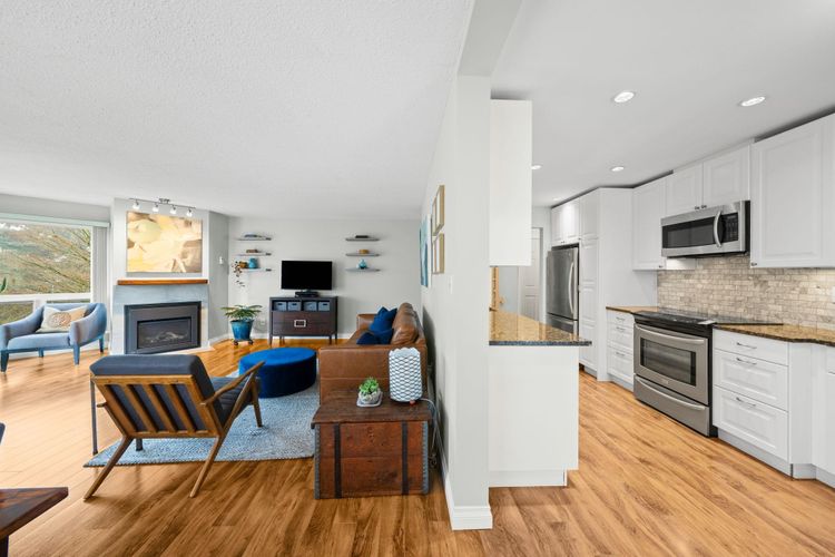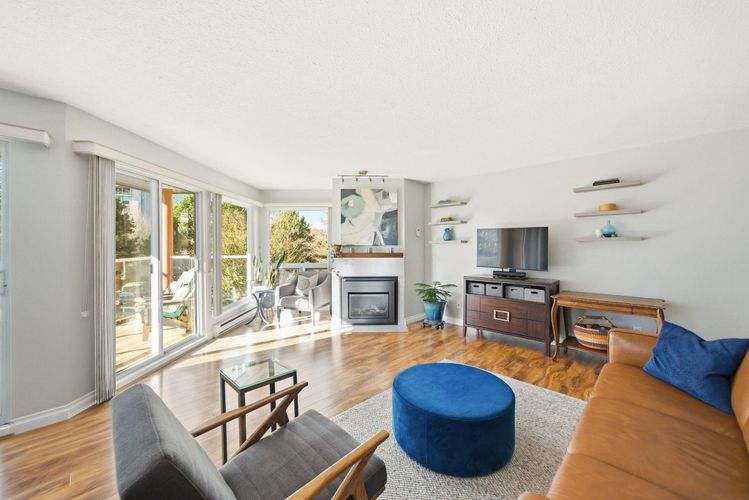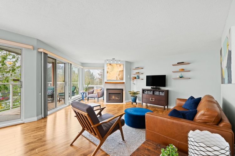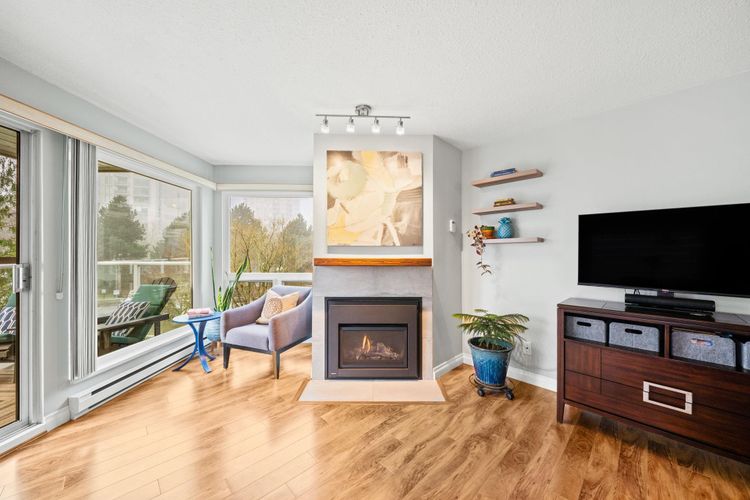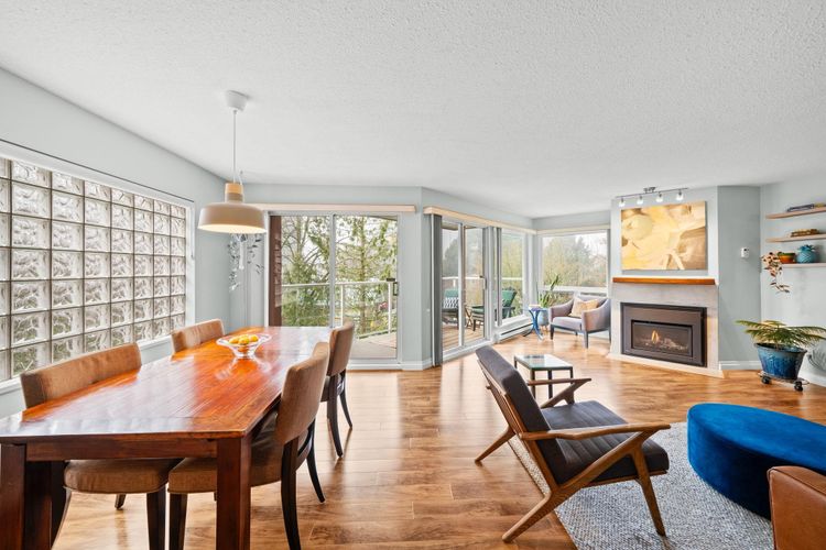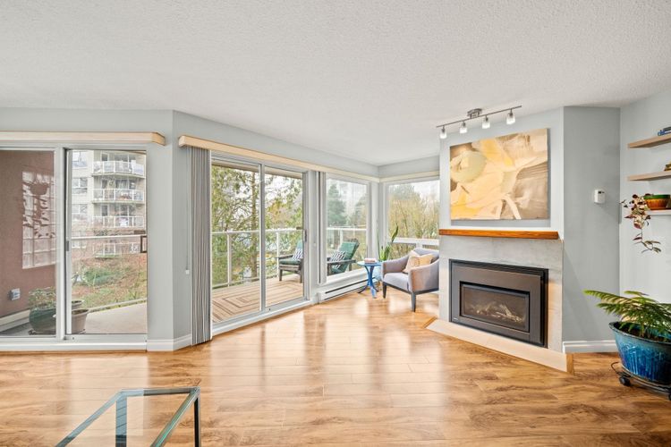 Spacious corner unit with 2 balconies in sought-after Tiffany Shores at the New West Quay. This 2 Bed, 2 Bath, 1,261 sf west-facing suite enjoys beautiful afternoon sun & partial river views, w/ mature trees adding extra privacy. Thoughtfully updated kitchen & bathrooms feature stainless steel appliances, stone counters, refreshed cabinetry, and modern light & plumbing fixtures. A marble-tiled entry, hardwood floors, and glass block feature wall bring in natural light. The side balcony off the kitchen is perfect for BBQing. The living room showcases a gas fireplace with wood mantle & opens onto a generous west-facing balcony. Enjoy waterfront living just steps to the boardwalk, SkyTrain, shops, and restaurants. Includes 1 parking stall and 2 storage lockers!