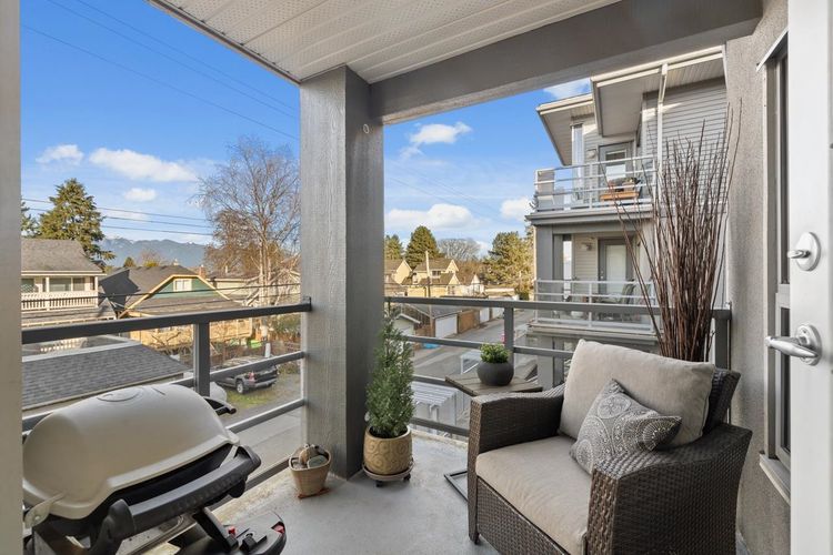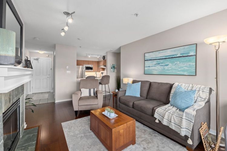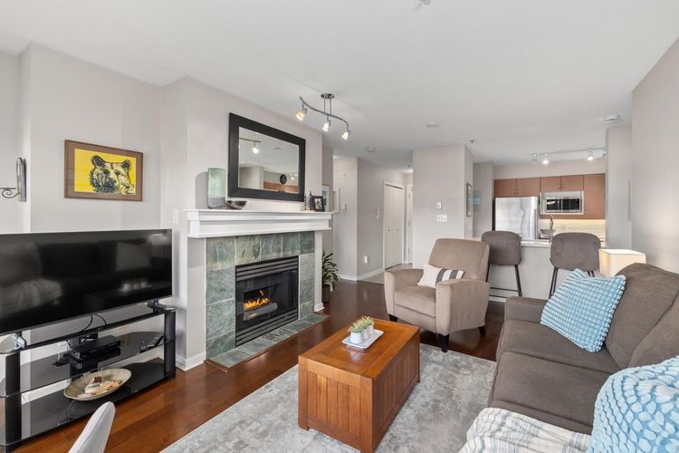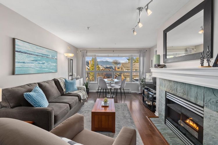 Welcome to this BRIGHT 2 Bed 2 Bath, view condo in the Bridgewater by BOSA! Located on the QUIET SIDE of the building, with VIEWS of the NORTH SHORE MOUNTAINS, this immaculately maintained condo has it all! SEPARATED BEDROOMS each with their own bathroom, UPDATED KITCHEN w/ full-size S/S appliances & new countertop/backsplash. Open concept living & dining areas are anchored by a cozy GAS FIREPLACE, and open up to the COVERED BALCONY. Additional upgrades include white wood blinds throughout and full-size washer & dryer. Own with pride in this boutique RAIN-SCREENED building with newer roof (2017) & parkade membrane replacement (2025). Live STEPS TO McBride Park, Tatlow Park, Linnea Beach, restaurants & shopping including the newly opened Fresh St. Market! Includes 2 side-by-side PARKING
