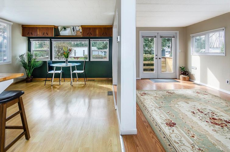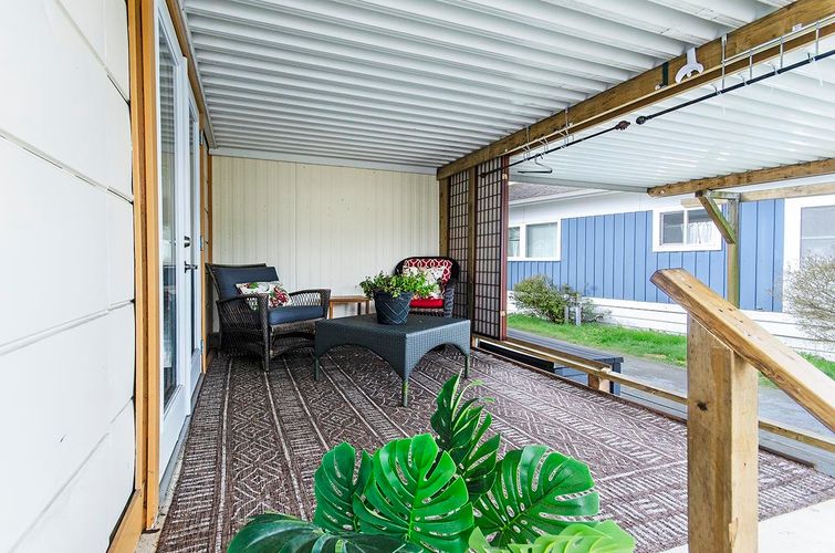 A Fantastic location in the Capilano Mobile Home Park. This lovely home is bathed in sunlight and has an airy, open plan living space with lots of flexibility for furniture placement. Brand new furnace, paint & blinds. The bathroom has been completely remodelled with a luxurious walk-in shower and vanity. It has a secluded front deck off the living room, as well as a spacious, covered, private deck in the backyard with French doors leading into the living space. Perfect for barbecuing and entertaining. Built-in closets, cabinets and dresser maximize storage. Enjoy the sunshine and mountain views in the large private backyard. Fenced yard for small pets. Must be 55+ to live here. Pets ok with permission. No rentals & no financing. 3 storage sheds included.